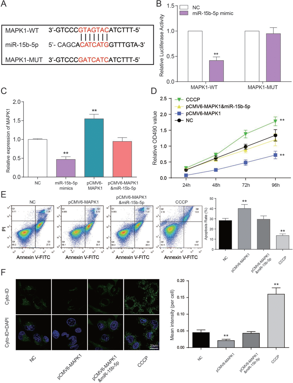 The binding site between MAPK1 and miR-15b-5p was shown in Figure 7A. Luciferase reporter assay was performed to explore the interaction between miR-15b-5p and MAPK1. The intensity of luciferase in HEK 293T cells co-transfected with MAPK1 wild type and miR-15b-5p mimics was remarkably reduced, while the type that are MAPK1 mutant had no obvious fluctuation (P<0.01, Figure 7B). Therefore, miR-15b-5p can directly target to MAPK1. In addition, expression level of MAPK1 in miR-15b-5p mimics group was notably declined while pCMV6-MAPK1 group was promoted according to the results of qRT-PCR. And MAPK1 expression level of miR-15b-5p mimics + pCMV6-MAPK1 group and NC group were approximately equal (P<0.01, Figure 7C). MTT assay illustrated that CCCP group emerged the highest cell viability. Nevertheless, pCMV6-MAPK1 group was significantly declined. And there’s nearly no difference between miR-15b-5p mimics + pCMV6-MAPK1 group and NC group (P<0.01, Figure 7D). On the basis of FCM assay, rate of cell apoptosis in CCCP group was suppressed and it was enhanced in pCMV6-MAPK1 group. Simultaneously, rate of cell apoptosis in miR-15b-5p mimics + pCMV6-MAPK1 group was still the same as NC group (P<0.01, Figure 7E). The results of autophagy assay proved that the cell autophagy in CCCP group were remarkably higher than other three groups. Autophagy in pCMV6-MAPK1 group was lower than others and the one in miR-15b-5p mimics + pCMV6-MAPK1 group was practically equivalent to NC group (P<0.01, Figure 7F). Taken together, miR-15b-5p represses MAPK1 to regulate cell viability and apoptosis rate and autophagy to affect CAD progress.