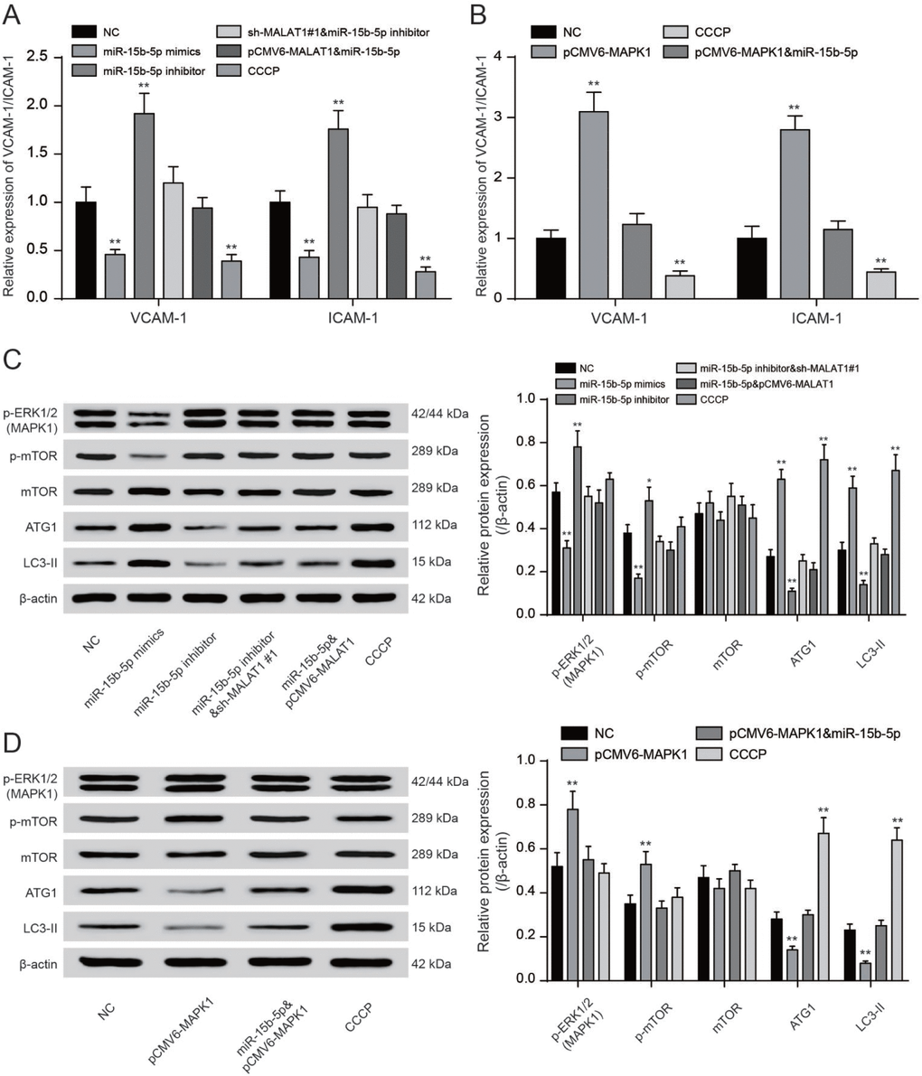 QRT-PCR showed that CCCP and miR-15b-5p mimics could significantly reduce VCAM-1/ICAM-1 expression while miR-15b-5p inhibitor and pCMV6-MAPK1 could promote VCAM-1/ICAM-1 expression (P<0.01, Figure 8A, 8B). MiR-15b-5p mimics could significantly reduce VCAM-1/ICAM-1 expression while the inhibiting effect could be offset by pCMV6-MALAT1 or pCMV6-MAPK1. MiR-15b-5p inhibitor could conspicuously increase VCAM-1/ICAM-1 expression while the promoting effect could be counteracted by sh-MALAT1#1 (P<0.01, Figure 8A, 8B). The levels of phosphorylated ERK1/2 were added in EPCs transfected with miR-15b-5p inhibitor or pCMV6-MAPK1 while reduced in EPCs transfected with sh-MALAT1#1 or miR-15b-5p mimics. Meanwhile, co-transfection of miR-15b-5p inhibitor and sh-MALAT1#1 or co-transfection of miR-15b-5p mimics and pCMV6-MAPK1 were consistent with NC group (P<0.01, Figure 8C). We next investigated the phosphorylation of mTOR at Ser2448 and the total mTOR. The phosphorylation of mTOR was strongly enhanced in both miR-15b-5p inhibitor and pCMV6-MAPK1 groups while CCCP and miR-15b-5p mimics groups obtained opposite results according to results of western blot. Meanwhile, we observed that the miR-15b-5p inhibitor + sh-MALAT1#1 group, miR-15b-5p mimics + pCMV6-MALAT1 as well as miR-15b-5p mimics + pCMV6-MAPK1 group were practically the same as the NC group (P<0.05, P<0.01, Figure 8C–8D). The western blot results showed that ATG1/LC3-II were strongly weaken in both miR-15b-5p inhibitor and pCMV6-MAPK1 groups while sh-MALAT1#1, CCCP and miR-15b-5p mimics groups obtained opposite results. Meanwhile, we observed that the miR-15b-5p inhibitor + sh-MALAT1#1 group, miR-15b-5p mimics + pCMV6-MALAT1 as well as miR-15b-5p mimics + pCMV6-MAPK1 group were practically the same as the NC group (P<0.05, P<0.01, Figure 8C–8D). Overall, lncRNA MALAT1 triggered mTOR signaling pathway via regulating miR-15b-5p and MAPK1.