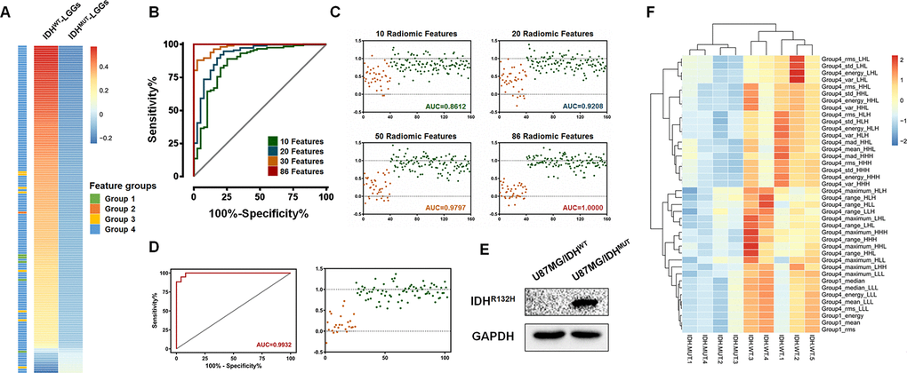 Then, we utilized the logistic regression algorithm to select the IDH mutation-specific signature. A series of ROC curves with relevant AUC was delineated using the given parameters. The results showed that only ten radiomic features were needed to divide 158 LGGs into an IDHWT group and an IDHMUT group with an AUC of 0.86, while the AUC was 0.92 for 20 features and 0.98 for 50 features (Figure 2B and 2C). Notably, using a classification model of 86 radiomic features, the enrolled patients were correctly classified into the IDHWT and the IDHMUT groups (AUC = 1.00, Figure 2B and 2C).
