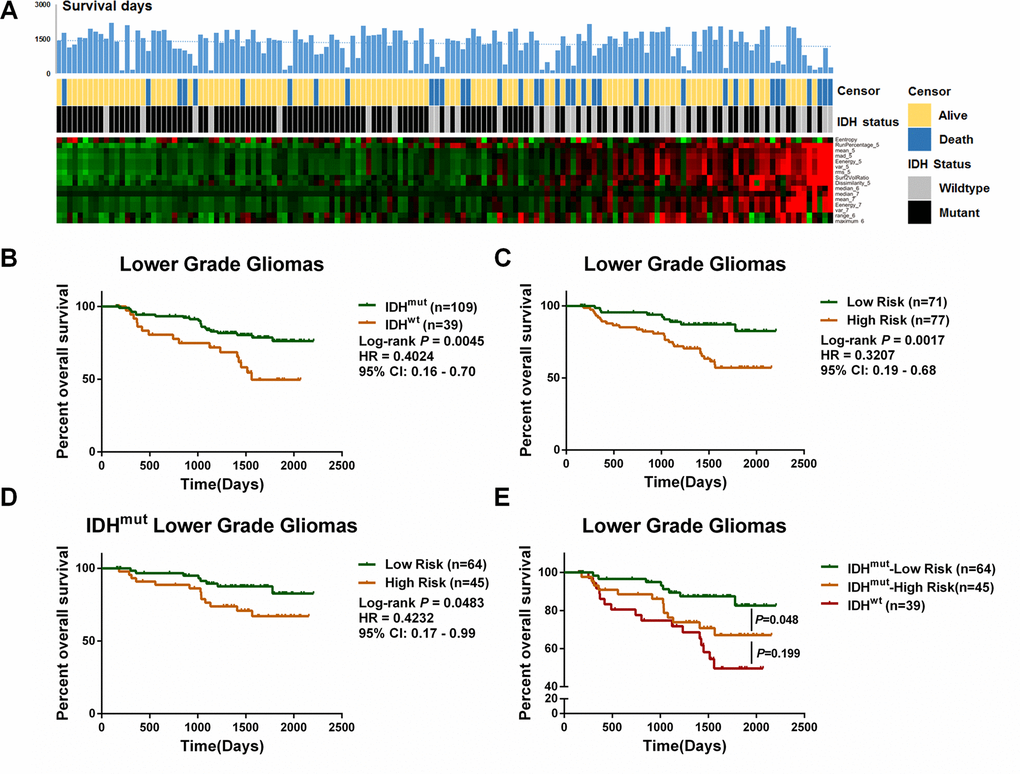 Using the calculated risk score, we divided the LGG patients into high-risk and low-risk groups. Patients with a high-risk score had a worse prognosis (Figure 3C, HR = 0.3207, P = 0.0017). Intriguingly, IDHMUT patients could be further categorized into IDHMUT-high risk and IDHMUT-low risk groups with significantly different OSs (Figure 3D, HR = 0.4232, P = 0.0483). A multivariate Cox analysis also demonstrated that the radiomic risk score could serve as a prognostic indicator for LGGs (Table 3). Moreover, the OS was not significantly different between the IDHWT–high risk groups and the IDHMUT-high risk groups (Figure 3E, P = 0.199), further emphasizing the prognostic value of the IDH-specific radiomic signature.
