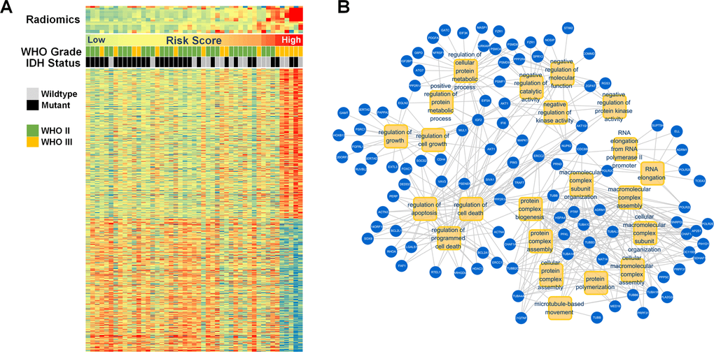 A recent study showed that IDH mutant high grade gliomas were more amenable to a complete resection of enhancing tumors and had an improved survival with the resection of non-enhanced tissues [43]. Therefore, preoperatively evaluating the IDH status may be beneficial for surgical decision making and for developing selective targeted therapy [25]. An increasing number of studies indicate that patients harboring IDH mutations have a better prognosis. However, some IDHMUT patients had a shorter survival than some IDHWT patients. In the present work, we used radiomic features to promote the prognostic prediction. The results implied that a combination of genetic alterations and radiomic changes could potentially provide a non-invasive methodology for genotype detection. What is more, the worse prognosis of high risk patients could be partially attributable to cell growth, metabolic processes, and programmed cell death, providing a new approach for developing therapeutic targets.
