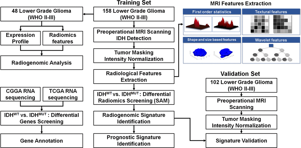 A total of 158 LGG patients who underwent surgical treatment between March 2006 and December 2012 were retrospectively selected as a training set. An additional 102 LGG patients who underwent surgical treatment from January 2016 to June 2016 were prospectively included as a validation set. The inclusion criteria were as follows: (1) pathologically confirmed lower grade glioma; (2) available IDH status; (3) available high-resolution preoperative T2-weighted MR images; (4) available clinical characteristics. The basic clinical characteristics of the patients, including age, gender, WHO grade, and tumor location are summarized in Table 1. The study was approved by the institutional review board of Beijing Tiantan Hospital. The design of the present study is illustrated in Figure 6.