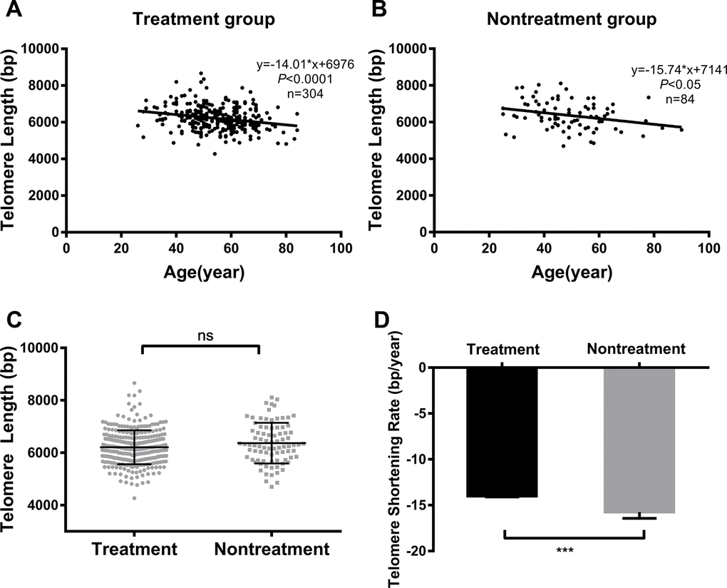 Pearson’s correlations analysis was performed to address the association between telomere length and age. Linear regression was also conducted to analyze the relationship between telomere length and age, and to calculate TSR. Stepwise regression analyses were applied to examine associations between age, treatment state, chronic complications, and telomere lengths.