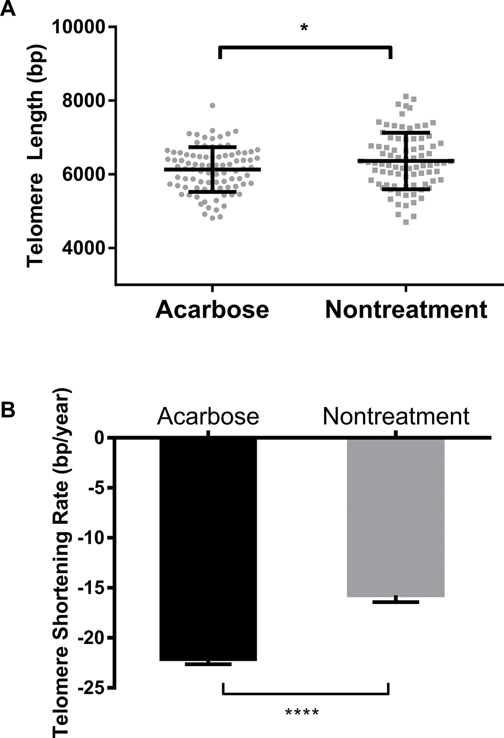 Because acarbose use was linked to higher TSR compared with other glycemic control regimens, we further compared baseline characteristics, telomere lengths, and TSR between the nontreatment group and the acarbose group.