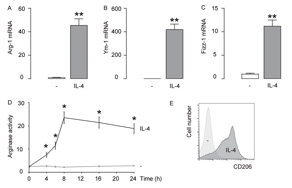 First, IL-4 was used to induce M2 macrophages from cultured macrophages derived from bone marrow in culture. To confirm the M2 macrophage polarization by IL-4, we examined the mRNA levels of Arginase 1 (Arg-1), Ym-1 and Fizz-1, three M2 macrophage markers. We found that IL-4 induced about 40 times’ increase in Arg-1 mRNA (Figure 1A), about 400 times’ increase in Ym-1 mRNA (Figure 1B), and about 10 times’ increase in Fizz-1 mRNA (Figure 1C). A typical characteristic of M2 macrophages is their potential role in converting L-arginine to ornithine and urea through the action of Arg-1. Thus, arginase activity was determined using a urea-based assay, showing significant increases in IL-4-treated macrophages (Figure 1D). CD206 is a surface marker exclusively expressed by M2 macrophages. We found that CD206 was induced in macrophages exposed to IL-4 by flow cytometry (Figure 1E). Together, these data suggest that IL-4-induces M2 macrophage polarization in vitro.
