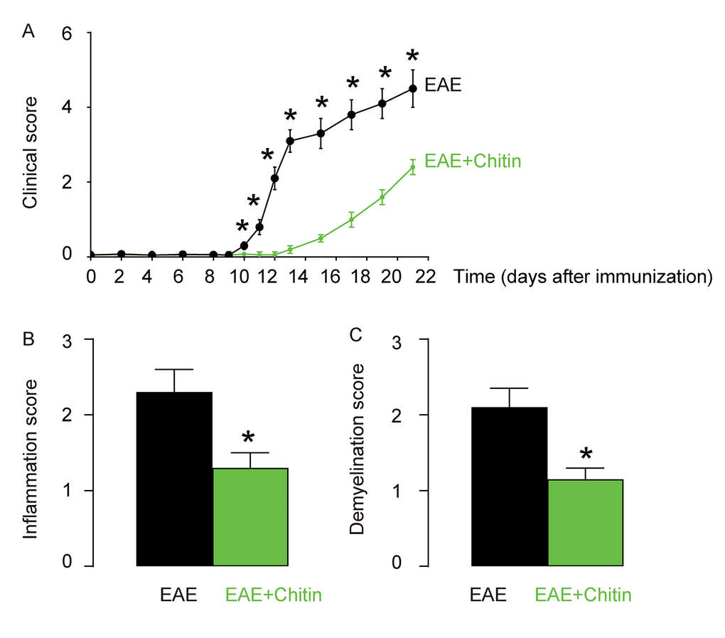Although inflammation and demyelination hallmark the pathology of EAE or MS, it is not clear whether macrophage polarization may play a role in the disease initiation, progression and severity. Administration of Chitin has been shown to induce IL-4-dependent recruitment and polarization of M2 macrophages [15,16]. Here, C57BL/6 mice were immunized with MOG35-55 in CFA to induce EAE. Some of the MOG35-55-treated mice were randomly selected to receive intraspinal injection of Chitin. The other MOG35-55-treated mice received intraspinal injection of same amount of DMSO as controls. The development and severity of clinical signs in the two groups of mice (EAE or EAE+Chitin) were monitored longitudinally till day 21 after immunization, when the mice were sacrificed to evaluate the pathological changes in the spinal cord. We found that Chitin administration significantly increased the M2 vs M1 macrophage ratio in the mouse brain by 16.6±1.8 folds, resulting in reduced the clinical score (Figure 3A), inflammation score (Figure 3B) and demyelination score (Figure 3C), suggesting that Chitin-induced M2 macrophage polarization reduces the severity of EAE.
