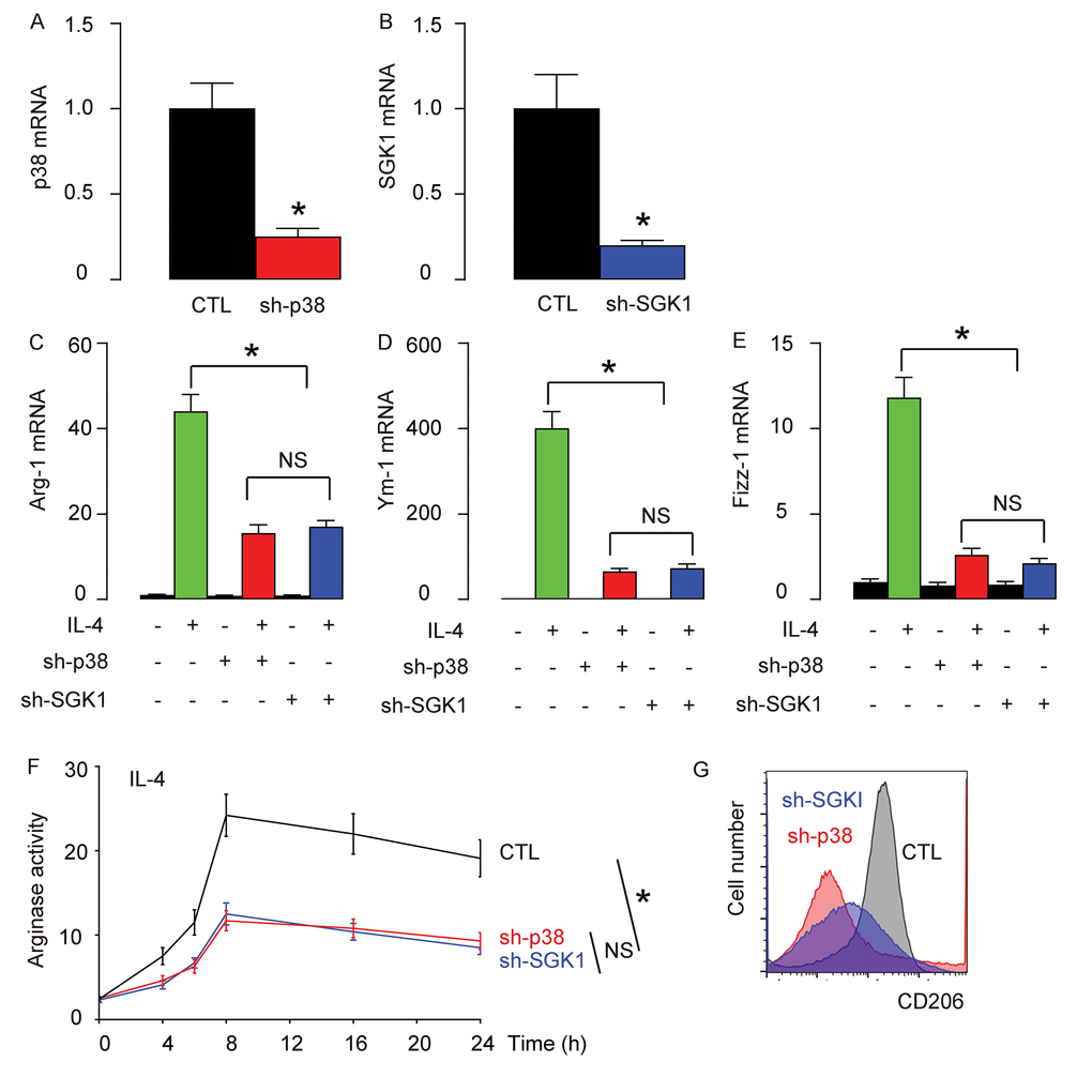 Macrophages were prepared from bone marrow, as described [28]. Macrophage were cultured in RPMI containing 10% FBS. Nonadherent cells were removed 2 h after seeding by extensive washing with medium. Cultured macrophages received 20 ng/mL of IL-4 (Sigma-Aldrich, St. Louis, MO, USA) for M2 induction. SB203580 (Sigma-Aldrich) is an inhibitor of p38, used at a concentration of 10 μM. SI113 is an inhibitor of SGK1, used at a concentration of 20 μM. Mock pretreatment was performed with vehicle control (Vh; DMSO, Sigma-Aldrich).