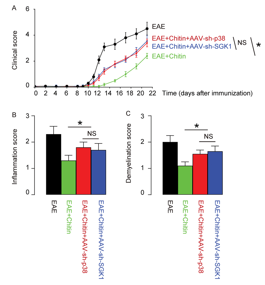Treatment with AAV-sh-p38 or AAV-sh-SGK1 attenuates the effects of Chitin on the severity of EAE