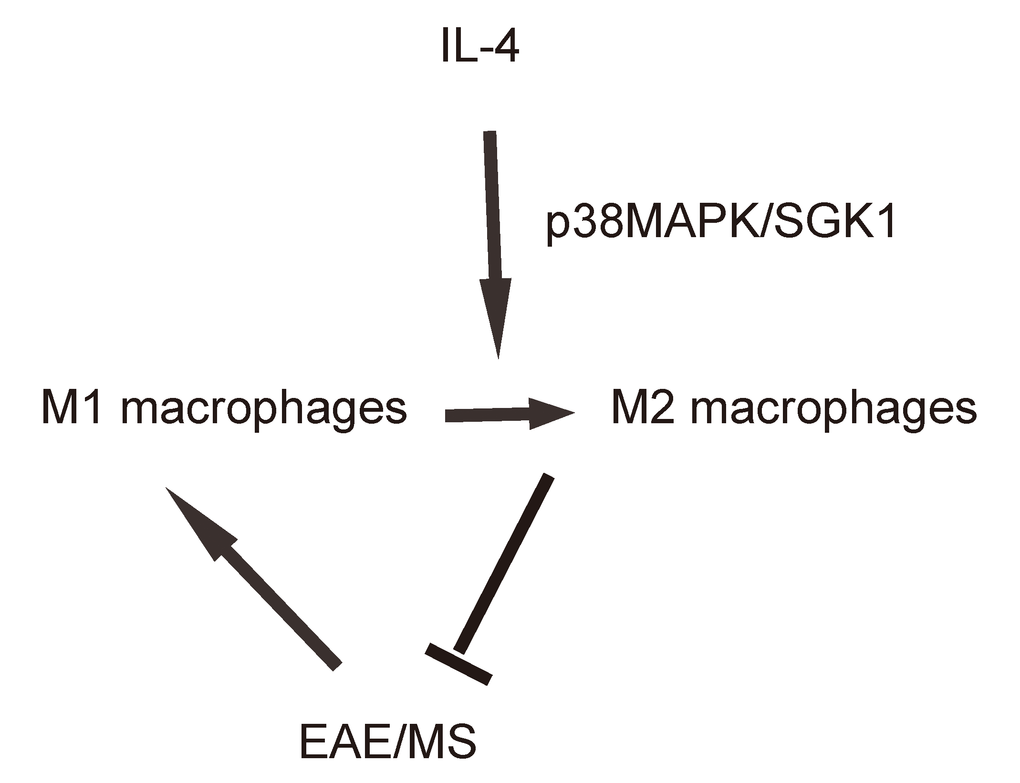 Since M1 and M2 macrophages play distinct roles in MS, we hypothesized that the MS may be treated or prevented through modulation of M1/M2 transition, or polarization. Previous studies have shown that macrophage polarization may be epigenetically or genetically affected by a number of factors or signaling pathways [22]. Although Stat6 signaling is traditionally believed to the major signaling pathway that controls IL-4-induced M2 macrophage polarization, emerging evidence suggest that p38MAPK/SGK1 signaling pathway also play a critical role [23]. Indeed, here we showed the requirement of this signaling pathway in EAE-associated M2 macrophage polarization, which determines the severity of the disease [23]. EAE is characterized by neuroinflammation, demyelination, axonal damage, and progressive neurological dysfunction, which perfectly mimics the pathological changes in MS [8]. In addition, all of the currently approved therapies for MS are also efficacious in EAE, or even initially developed using EAE, which confirms the relevance of this model [24].