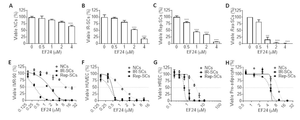 Table 2. EC50 values of EF24 against non-senescent cells (NCs), and IR- or Rep-induced senescent WI‐38 and IMR-90 fibroblasts, HUVEC, HREC and pre-adipocytes.