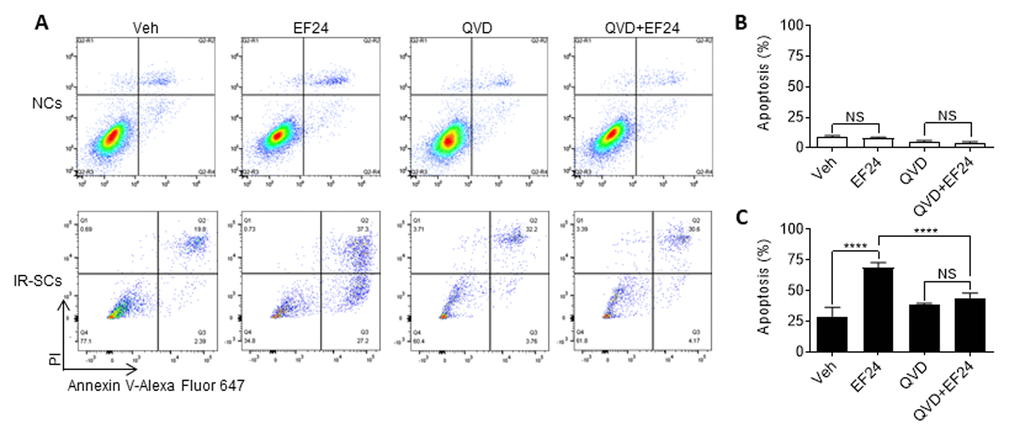Next we determined whether EF24 reduces WI-38 IR-SCs viability through induction of apoptosis. This was done by measuring the percentage of Annexin-V positive and Annexin-V/propidium iodide (PI) double positive apoptotic cells by flow cytometry after Annexin-V and PI staining. As shown in Figure 3A and B, EF24 treatment did not induce apoptosis in NCs. However, it significantly increased the number and percentage of Annexin-V positive apoptotic cells in IR-SCs compared to vehicle treatment. To determine whether EF24 induces SCs apoptosis via activation of caspases, we next treated NCs and IR-SCs with Q-VD-OPh (QVD, a pan-caspase inhibitor) [26] prior to the addition of vehicle or EF24. The data show that QVD pretreatment completely blocked the effect of EF24 on the induction of SCs apoptosis (Figure 3A and C). However, there were not any significant changes in the number of PI positive cells representing necrotic cells in IR-SCs after EF24 treatment, suggesting EF24 does not induce IR-SCs necrosis. Collectively, these results suggest that EF24 selectively reduces SCs viability via induction of apoptosis.