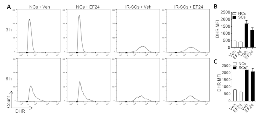 It has been shown that EF24 induces apoptosis in various tumor cells in part by increasing ROS production and inducing oxidative stress-mediated endoplasmic reticulum stress [27,28]. To test whether EF24 induces SCs apoptosis also by increasing ROS production, we measured the intracellular ROS levels in WI-38 NCs and IR-SCs 3 h and 6 h after EF24 treatment using flow cytometry after dihydrorhodamine 123 (DHR) staining (Figure 4A). Compared to NCs, IR-SCs produce significantly higher levels of ROS at both time points (Figure 4B and C). Similar finding was reported by us and others before [10,29,30]. However, EF24 did not increase ROS production in NCs and IR-SCs at both 3 h and 6 h (Figure 4B and C). Even when the cells were treated with EF24 for a longer duration (i.e. for 24 h and 72 h), we still could not detect any changes in ROS production in the cells (data not shown). This finding suggests that EF24 induces apoptosis in SCs in a ROS production independent manner.