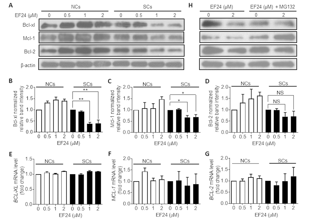 To further explore the mechanism by which EF24 selectively induces SCs apoptosis, we examined the effect of EF24 on the expression of the Bcl-2 family anti-apoptotic proteins by western blots, because we and others previously demonstrated that Bcl-xl and Bcl-2 were upregulated in SCs to protect SCs from apoptosis [31–33]. The results show that EF24 could significantly reduce the expression of Bcl-xl and Mcl-1 in WI-38 IR-SCs but not in NCs in a dose-dependent manner (Figure 5A-C). Although the levels of Bcl-2 were also slightly reduced in IR-SCs after EF24 treatment but its reduction did not reach the statistical significance (Figure 5A and D). To test whether EF24 downregulates the Bcl-2 family proteins through regulating their gene transcription, we quantified BCL-XL, MCL-1 and BCL-2 mRNA levels after EF24 treatment, but did not observe any significant changes in their gene expression (Figure 5E-G). Next we examined whether EF24 can regulate the expression of the Bcl-2 family anti-apoptotic proteins at the level of post-transcription, particularly via proteasome degradation. We treated WI-38 IR-SCs with the proteasome inhibitor MG132 prior to EF24 treatment and then measured the expression of these Bcl-2 family proteins by western blots. As showed in Figure 5H, pretreatment of MG132 abrogated the downregulation of these Bcl-2 family proteins by EF24 in SCs, while it had no significant effect on the expression of these proteins in NCs. These results suggest that EF24 may selectively induce SCs apoptosis by promoting proteasome degradation of the Bcl-2 family proteins. The mechanisms by which EF24 can promote the degradation of these Bcl-2 family proteins selectively in SCs have yet to be determined.