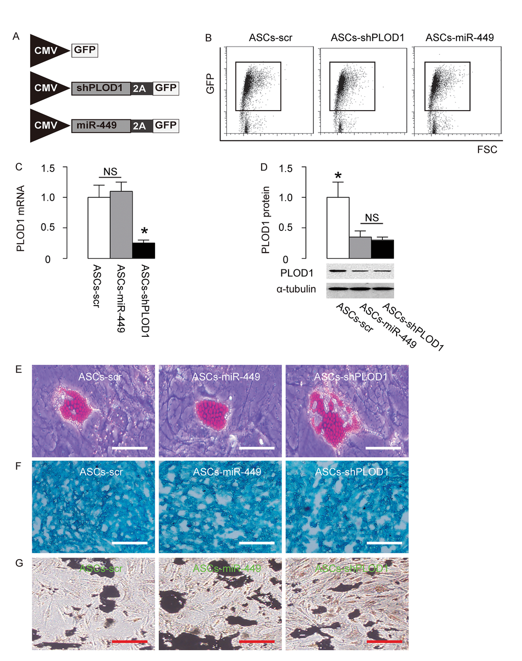 Since we detected high levels of PLOD1 in ASCs, here we aimed to increase the anti-scar potential of ASCs during wound healing through suppression of PLOD1. Two approaches were used. First, ASCs were transduced with an AAV carrying short-hairpin small interfering RNA for PLOD1 (shPLOD1). Second, ASCs were transduced with an AAV carrying miR-449. Both viruses also contained a GFP reporter. ASCs transduced with an AAV carrying GFP and scr were used as a control (Figure 3A). After transduction of rat ASCs were these AAVs, the successfully transduced cells were purified based on GFP expression by flow cytometry (Figure 3B). PLOD1 levels were determined in these modified ASCs by RT-qPCR (Figure 3C) and Western blotting (Figure 3D). We found that expression of miR-449 in ASCs did not alter PLOD1 mRNA (Figure 3C), but significantly decreased PLOD1 protein (Figure 3D). On the other hand, suppression of PLOD1 in ASCs by shRNA significantly decreased both PLOD1 mRNA (Figure 3C) and PLOD1 protein (Figure 3D). Moreover, the PLOD1 protein in ASCs by miR-449 and by shPLOD1 was no difference (Figure 3D). Hence, two approaches may similarly alter PLOD1 protein levels. Finally, the ASCs-miR-449, ASCs-shPLOD1 and control ASCs-scr were subjected to differentiation assays to confirm the MSC-phenotype after genetic editing. We performed Oil red O staining to evaluate adipogenic induction (Figure 3E), Alcian blue staining to evaluate chondrogenetic induction (Figure 3F) and Von Kossa staining to evaluate osteogenic induction (Figure 3G). Our data confirmed the maintenance of the MSC phenotype of ASCs-miR-449, ASCs-shPLOD1 and control ASCs-scr.