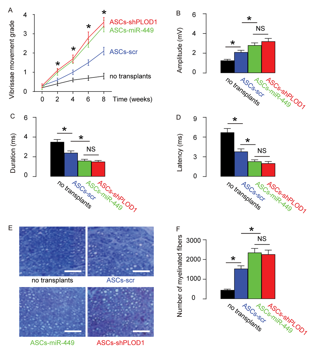 Next, we assessed if ASCs-miR-449 or ASCs-shPLOD1 may have therapeutic effects on facial nerve regeneration than ASCs. Thus, transplantation of either ASCs-shPLOD1 or ASCs-miR-449 or ASCs-control to repair a 6mm-gap in rat facial nerve was compared. The rats were kept for 8 weeks after surgery. The measurement of vibrissae movement grade showed that either ASCs-shPLOD1 or ASCs-miR-449 exhibited a better facial nerve function than ASCs-scr (Figure 4A). CAMPs analysis at 8 weeks showed that either ASCs-shPLOD1 or ASCs-miR-449 exhibited a greater amplitude (Figure 4B), a shorter duration (Figure 4C) and a shorter latency (Figure 4D), than ASCs-scr. Moreover, either ASCs-shPLOD1 or ASCs-miR-449 significantly increased the myelinated fibers than ASCs-scr, shown by representative images (Figure 4E), and by quantification (Figure 4F). Together, these data suggest that transplantation of either ASCs-miR-449 or ASCs-shPLOD1 exerts better functional facial nerve regeneration than ASCs in rats.