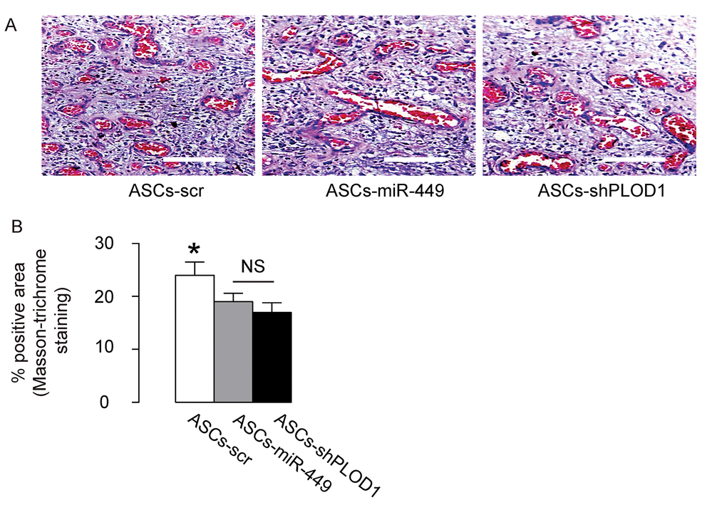 Then we evaluated the effects of transplantation of ASCs-miR-449, ASCs-shPLOD1 and control ASCs-scr on the fibrosis 8 weeks after surgery in rats. We found that transplantation of either ASCs-miR-449 or ASCs-shPLOD1 significantly reduced the fibrosis at the site of injury, compared to transplantation of ASCs-scr, shown by representative images (Figure 5A), and quantification (Figure 5B). These data suggest that transplantation of either ASCs-miR-449 or ASCs-shPLOD1 may improve the anti-fibrotic effects of ASCs.