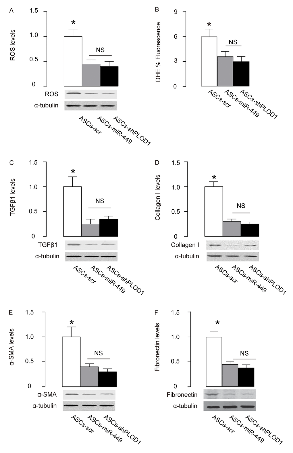 Finally, we examined the mechanisms underlying the improved anti-fibrotic potential by PLOD1 suppression in ASCs. Reactive oxygen species (ROS) is critical for fibrogenesis. We examined the levels of ROS at the site of injury and found that transplantation of either ASCs-miR-449 or ASCs-shPLOD1 significantly reduced the ROS levels at the injury site, compared to transplantation of ASCs-scr, by Western blotting (Figure 6A) and by DHE assay (Figure 6B). Transition of myofibroblasts from fibroblasts plays a pivotal role in fibrogenesis. Since α-SMA and TGFβ1 are specific markers for myofibroblasts, we analyzed the levels of these two proteins, as well as a fibrotic marker Collagen I and fibronectin at the site of skin injury. We found that transplantation of either ASCs-miR-449 or ASCs-shPLOD1 significantly reduced the TGFβ1 levels (Figure 6C), Collagen I levels (Figure 6D), α-SMA levels (Figure 6E), and fibronectin levels (Figure 6F) at the site of the injury, compared to transplantation of ASCs-scr. Thus, suppression of PLOD1 levels in ASCs either directly by shPLOD1 or indirectly by miR-449 may substantially improve the anti-fibrotic potential of ASCs during facial nerve regeneration.