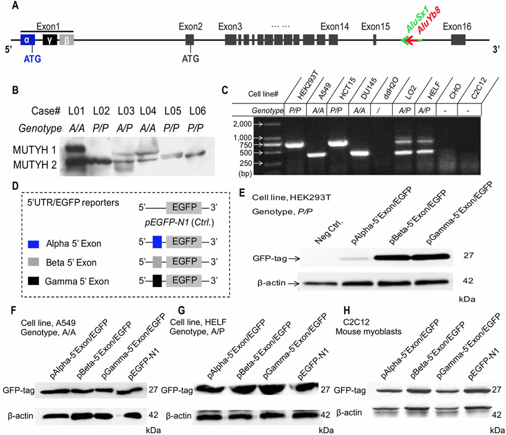 Human cells (A549, HELF, HEK293T, LO2, DU145 and HCT15) and rodent cells (CHO and C2C12) were grown in suitable complete growth medium (see the Supplementary Methods) and maintained in a humidified incubator at 37°C with 5% (v/v) CO2. To investigate whether polymorphic AluYb8MUTYH played a regulatory role in the MUTYH 5’-untranslated sequence at the translational level, the three conventional 5’ exon sequences of MUTYH transcripts were cloned, including the 5’-untranslated exon sequences from the α-, β- and γ-type MUTYH transcripts (named α-5’Exon, β-5’Exon and γ-5’Exon, respectively). The three fragments were initially amplified with the designed forward and reverse primers (Supplementary Table 3) and then inserted into the pEGFP-N1 vector using Bgl II and Pst I restriction sites. The three pEGFP-N1-based recombinant plasmid constructs (named pAlpha-5’Exon/EGFP, pBeta-5’Exon/EGFP, and pGamma-5’Exon/EGFP) were confirmed by sequencing. The cultured cells were grown to 60–80% confluence and transfected with the recombined and control plasmids (pEGFP-N1) using an effective transfection reagent (Lipofectamine 3000, Invitrogen). The cells were harvested for analysis after 48 hours in culture.