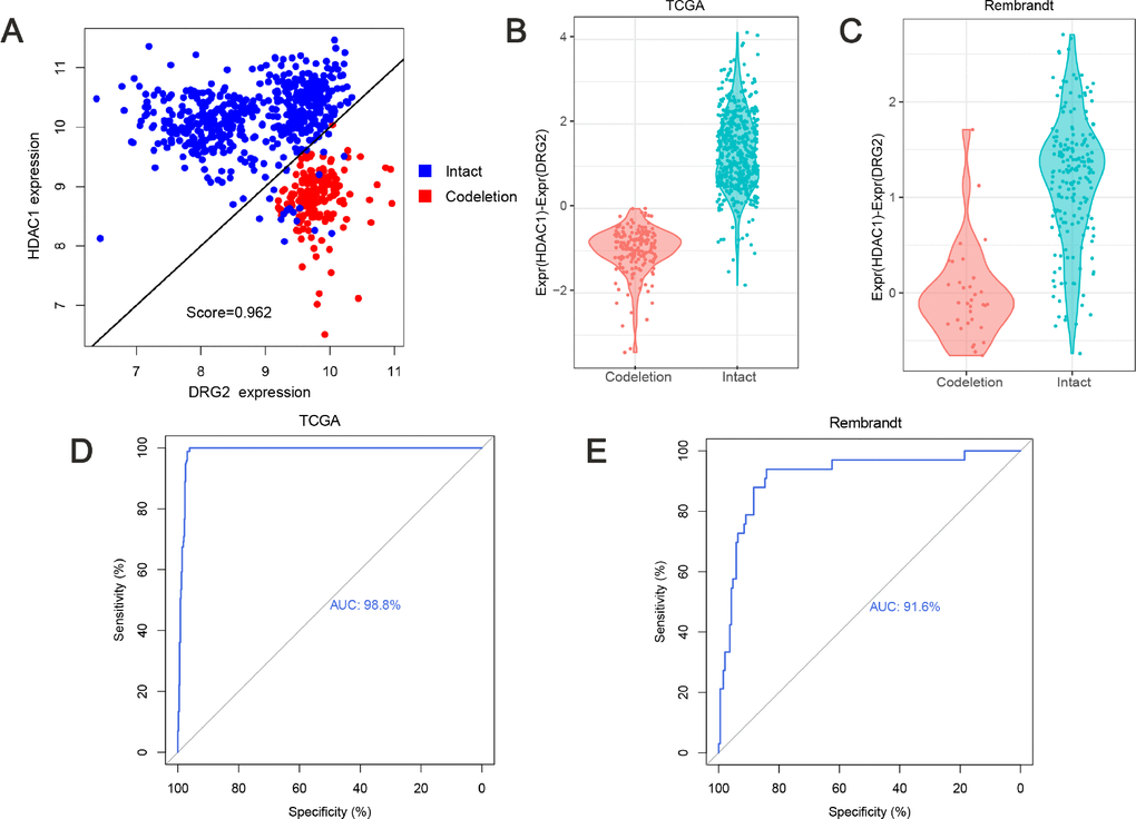 TSPairs method which compared the two genes expression ratio was used in breast cancer and lung adenocarcinoma for classification and prognosis [24, 25]. In the training dataset, with the tspcalc function, HDAC1(Histone deacetylase 1) and DRG2 (Developmentally regulated GTP binding protein 2) gene pair which had the highest TSP score (0.962) was selected as the most consistent switch (Figure 1A). In 1p/19q co-deleted group, 89.6% (172/192) 1p/19q co-deleted patients had a lower expression of HDAC1 than DRG2, while 100% (500/500) 1p/19q intact patients had a lower expression of DRG2 than HDAC1 (Figure 1B, p=0.0063, chi-square test). And the Receiver Operating Characteristic (ROC) curve showed that this model achieved an area under the curve (AUC) of 0.9878 (Figure 1D). With this prediction model, in the validation dataset, we got a similar result (Figure 1C, p<0.0001, chi-square test) and the AUC was 0.9165 (Figure 1E). Previously studies showed that HDAC1, locating at chromosome 1p, might serve as a good diagnostic and prognostic marker for lung cancer [26]. Overexpressing DRG2, locating at chromosome 17p, could delay cell-cycle arrest and apoptosis [27].