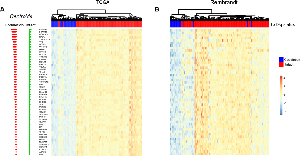PAM method exhibited powerful predictive capabilities in rectal cancer by selecting a group of genes [30]. The centroid shrinkage value of 10.984 which containing a minimum of 53 genes and 7 misclassification errors was selected in the training dataset (Figure 3A). Then the RNA expression profile of the 53 genes in the two datasets were clustered. In the training dataset, two branches were identified: the first branch contained 91.0% (172/189) 1p/19q co-deleted samples, while the second branch contained 100% (503/503) 1p/19q intact patients (Figure 3A). In the validation cohort, two branches were identified as expected. The first branch contained 45.5% (25/55) 1p/19q co-deleted patients. Meanwhile, 98.8% (164/167) 1p/19q intact patients were grouped into the second branch (Figure 3B).