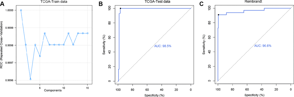 Caret method, a powerful machine learning algorithm, was designed for predictive modeling in practice with gene expression data and has been applied in predicting clinical outcome of patients with Alzheimer's disease [31]. In each cross validation, 20% samples in the training dataset were selected as TCGA-Train data to build predictive model and the rest of samples in the training dataset were grouped into TCGA-Test data to estimate the efficiency of the model. In the TCGA-Train dataset, the partial least squares discriminant analysis (PLSDA) method [32] was performed to build regression models and 10-fold cross-validation was used to examine the predictive efficiency [33]. As shown in ROC curve, the AUC was more than 0.999 in every repeated cross-validation cohort (Figure 4A) and the maximum value was 1.0 (ncomp=1). Then we predicted 1p/19q status with the best model. In the TCGA-Test dataset, 93.48% (43/46) 1p/19q co-deleted patients and 100% (126/126)1p/19q intact patients were successfully predicted. And in the validation dataset, 85.7% (30/35) 1p/19q co-deleted patients and 98.4% (184/187) 1p/19q intact patients were successfully predicted. The AUC values for TCGA-Test dataset and validation dataset were 0.985 (Figure 4B) and 0.966 (Figure 4C), respectively.