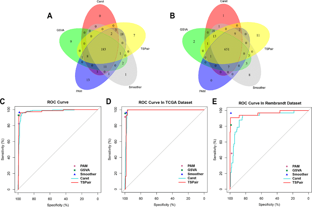 Meanwhile, when integrated samples in TCGA and Rembrandt dataset, the smoother (96.5%) and PAM (82.3%) exhibited the highest sensitivity and lowest level of sensitivity among five methods, respectively (Figure 6C). And TSPair (97.9%) showed the lowest level of specificity. The sensitivity and specificity of five methods in predicting 1p/19q status in TCGA dataset exhibited similar trends (Figure 6D). Except TSPair (89.6%), the sensitivities of other methods were all more than 90% and smoother (96.5%) was still the highest one. The TSPair (100%) and PAM (100%) methods had the highest specificity while smoother method (98.3%) had the lowest specificity. However, in Rembrandt dataset, the sensitivities of GSVA (81.6%), PAM (45.5%), Caret (85.7%) and TSPair (64.5%) were all decreased obviously. Only smoother (sensitivity = 96.7%, specificity = 98.8%) method remained a higher accuracy in predicting the 1p/19q status.