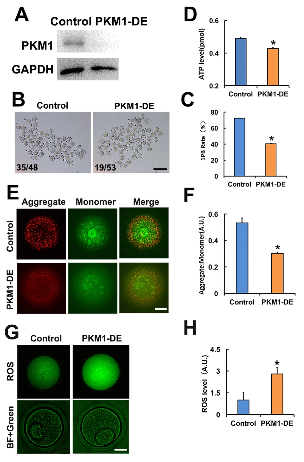 Studies addressing PKM1/PKM2 functions in oocytes are lacking. Attending concerns about incomplete depletion of target protein after siRNA-mediated knockdown, and based on the successful use of antibody-mediated protein depletion [18] and our previous experience in oocytes [19], we decided to use antibody transfection to deplete PKM1 (Figure 1A) and other proteins of interest. PKM1 depletion significantly reduced both first polar body (1PB) extrusion (Figures 1B and 1C), and ATP content (Figure 1D). Furthermore, mitochondrial membrane potential (assessed by JC-1 staining) was also reduced (Figures 1E and 1F), while ROS levels increased significantly (Figures 1G and 1H). These results indicated that PKM1 expression crucially affects multiple aspects of oocyte quality. However, unexpectedly, PKM2 depletion caused very similar effects (Supplementary Figures 1A and 1G).