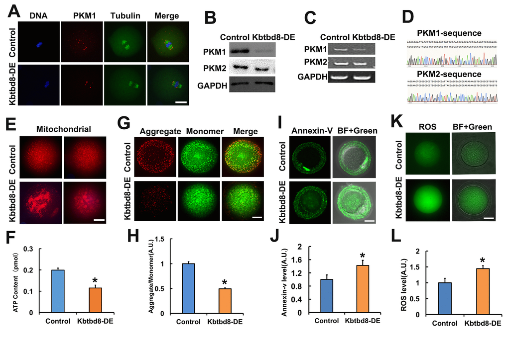 Next, we investigated how is PKM1 expression regulated. In another project, we observed that KBTBD8, a female fertility factor with ubiquitin ligase activity, interacted with PKM. So herein we first compared PKM1 localization and abundance in control and KBTBD8-depleted oocytes. In control oocytes PKM1 immunofluorescence showed a scattered punctuated pattern throughout the cytoplasm, as well as enrichment at spindle poles. In contrast, PKM1 staining of both cytoplasm and spindle poles diminished significantly after antibody-mediated depletion of KBTBD8 (Figure 2A). Western blotting confirmed that KBTBD8 depletion dramatically reduced PKM1 expression, but had little effect on PKM2 levels (Figure 2B). Similarly, RT-PCR demonstrated that PKM1 mRNA levels decreased significantly, while PKM2 mRNA levels remained unchanged (Figure 2C), in KBTBD8-depleted oocytes. PKM1 and PKM2 mRNA bands were verified by sequencing (Figure 2D). Next, we examined whether oocyte quality was affected by KBTBD8 depletion. In KBTBD8-depleted oocytes the mitochondria formed large, irregularly distributed aggregates (Figure 2E). Accordingly, both intracellular ATP levels (Figure 2F), and mitochondrial membrane potential (Figures 2G and 2H) were reduced significantly. In addition, apoptosis (Figures 2I and 2J), and ROS generation (Figures 2K and 2L) were considerably elevated after KBTBD8 depletion. These results suggest that KBTBD8 depletion severely compromises oocyte quality, probably due to decreased PKM1.
