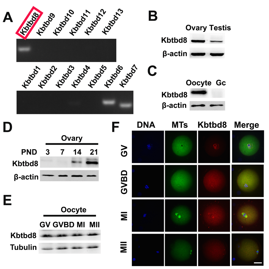Due to the significant impact of KBTBD8 inhibition on oocyte quality, we further investigated its expression during meiosis, and the effects of its depletion on meiotic phenotypes and regulatory enzymes. We first compared mRNA expression of all KBTBD family members in oocytes. KBTBD6, KBTBD7, and KBTBD8 were similarly and prominently expressed, while the other KBTBD members were almost undetectable (Figure 3A, and Supplementary Table 1). Furthermore, KBTBD8 was far more abundant in ovaries than in testes (Figure 3B), and in oocytes than in granular cells (GCs) (Figure 3C), indicating that KBTBD8 might function primarily in female gametogenesis. Temporal expression analysis showed that ovarian KBTBD8 expression was very low on post-natal day 1 (PND1), increased abruptly by PND14, and peaked on PND21, when initial follicle activation/maturation occurs (Figure 3D). These results indicated that KBTBD8 functions mainly during meiotic transition from GV to MII, rather than in the meiotic prophase (from leptone to diplotene). Next, we further examined KBTBD8 expression and subcellular localization during meiosis. Whereas KBTBD8 levels remained constant through all stages (Figure 3E), its expression was concentrated within nuclei during GV and at the spindle poles during MI and MII (Figure 3F).
