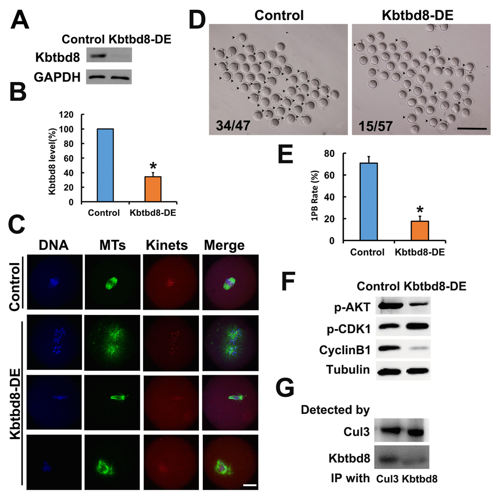 Next, we assessed whether KBTBD8 depletion affected the activities of kinases known to be essential for oocyte meiosis. We found that Cyclin B levels were reduced, while phosphorylated Cdk1 (p-Cdk1) was increased, indicating that KBTBD8 depletion decreased maturation promoting factor (MPF) activity. This notion was further supported by the finding that germinal vesicle breakdown (GVBD), which depends on MPF activity, was also decreased in KBTBD8-depleted oocytes after 3 hours of IVM (Supplementary Figures 2A and 2B). Furthermore, phosphorylated Akt (p-Akt) was also markedly diminished (Figure 4F, and Supplementary Figures 2C and 2F).