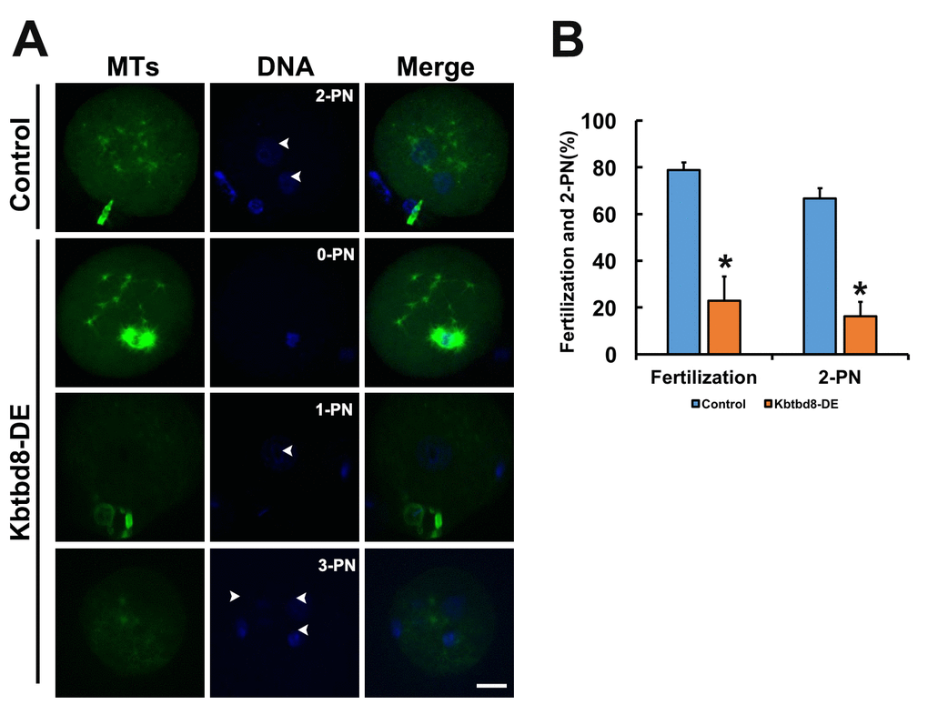 We next examined the meiotic phenotype after KBTBD8 depletion (Figures 4A and 4B). At 8 hours of IVM (in vitro maturation) the spindle assembly and chromosome alignment were severely disrupted (Figure 4C); at 16 hours of IVM, the percentage of mature oocytes (as 1PB) was significantly decreased (Figures 4D and 4E). Furthermore, the fertilization rate and the rate of normally fertilized eggs (2PN) were both significantly decreased after KBTBD8 depletion (Figures 5A and 5B).
