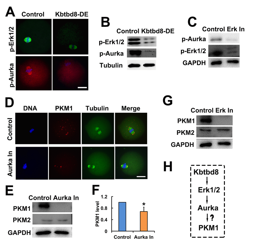 All chemicals and reagents were obtained from Sigma (St. Louis, MO, USA) unless otherwise stated. Primary antibodies were mouse anti-β-actin (Cat#: A5316-100; Santa Cruz, Dallas, TX, USA); mouse anti-GAPDH (Cat#: 30201ES60; YEASEN, Shanghai, China); human anti-centromere CREST (Cat#: 15-234; Antibodies Incorporated, Davis, CA, USA); rabbit polyclonal anti-phospho Aurora Kinase (p-Thr288) (Cat#: SAB4503898; Sigma); rabbit polyclonal anti-cyclin B1 (Cat#: 55004-1-AP; Proteintech, Rosemont, IL, USA); rabbit polyclonal anti-Kbtbd8 (Cat#: 1096; ZoonBio Biotechnology, Nanjing, China); rabbit polyclonal anti-CDK1 (p-Thr14) (Cat#: OAAN02724; Aviva Systems Biology, San Diego, CA, USA); mouse anti-diphosphorylated Erk-1&2 (Cat#: M9692; Sigma); rabbit polyclonal anti-PKM1 (Cat#: ab116271; Abcam, Cambridge, UK); and rabbit polyclonal anti-PKM2 (Cat#: BS6443; Bioworld Technology, Dublin, OH, USA). Secondary antibodies were Cy2-conjugated donkey anti-mouse IgG (Code: 715-225-150), Rhodamine (TRITC)-conjugated donkey anti-human IgG (Code: 709-025-149), Cy2-conjugated donkey anti-human IgG (Code: 709-225-149), and Cy2-conjugated donkey anti-rabbit IgG (Code: 711-225-152), all purchased from Jackson ImmunoResearch Laboratory (West Grove, PA, USA). Horseradish peroxidase (HRP)-conjugated rabbit anti-goat IgG and HRP-conjugated goat anti-mouse IgG were purchased from Vazyme (Nanjing, Jiangsu, China). Aurora A Inhibitor I (Cat#: S1451) and the Erk1/2 inhibitor SCH772984 (Cat#: S7101), both from Selleck Chemicals (Houston, TX, USA), were dissolved in dimethyl sulfoxide at a concentration of 5 or 10 mM. GV oocytes were treated with 10 μM Aurora A Inhibitor or ERK1/2 inhibitor for 24 h.