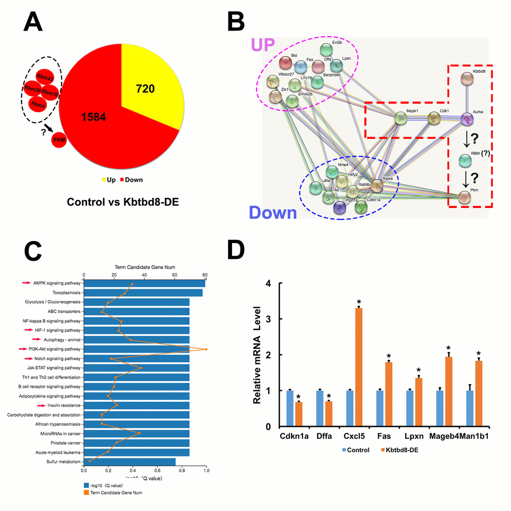 Next, we compared mRNA sequencing data between control and KBTBD8-depleted oocytes to further uncover whether KBTBD8 might regulate oocyte meiosis and maintain oocyte quality via other mechanisms. Overall, there were 2304 differentially expressed genes (KBTBD8/control log2>2; Supplementary Datasets 1 and 2). Of those, 69% (1584) were downregulated (Figure 7A, and Supplementary Dataset 1), indicating that the primary effect of KBTBD8 was to stabilize mRNAs. Although the log2 ratio for PKM was less than 2 (90.83/50.51=1.84), its downregulation is consistent with that seen in KBTBD8-depleted oocytes, and agrees well with our results (Figure 2A). Thus, PKM was included among other downregulated genes (Figure 7A, individual small red region).