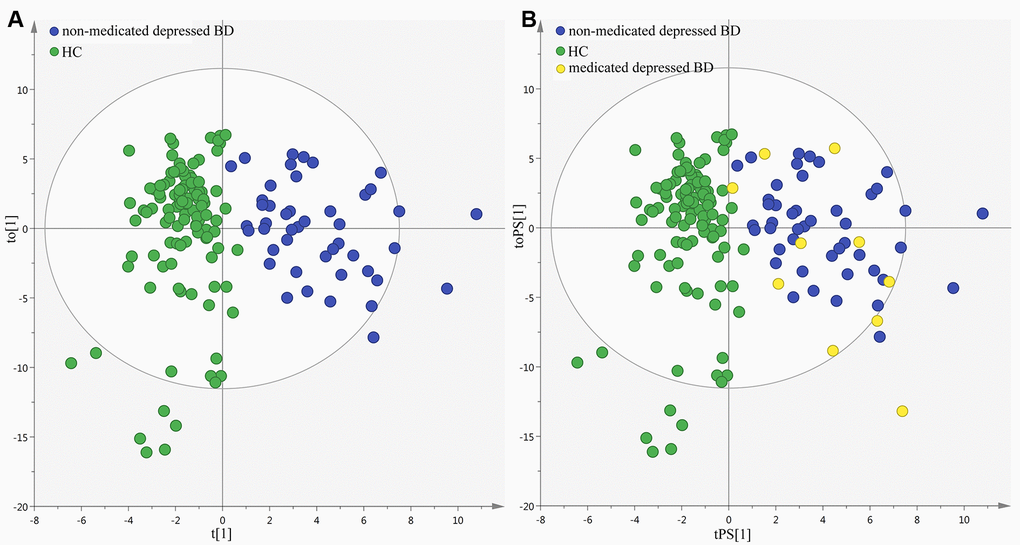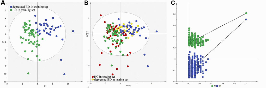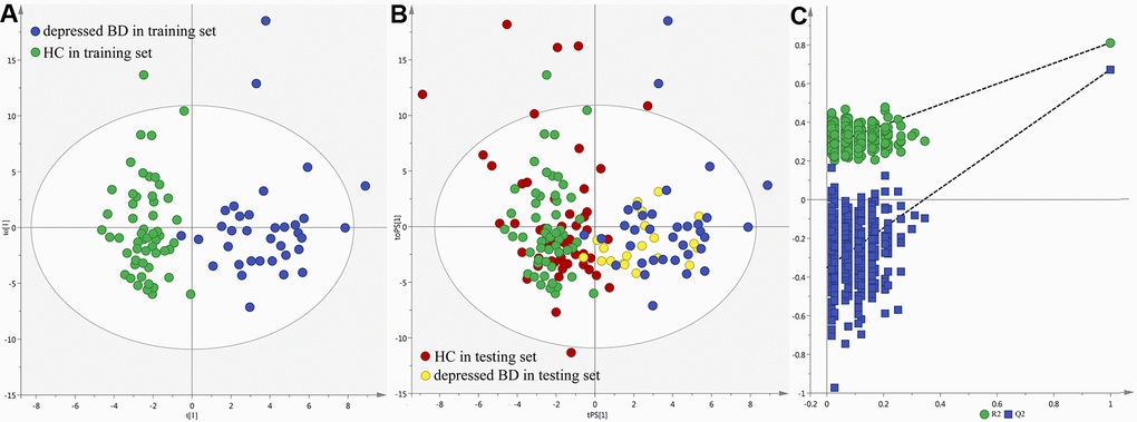 The score plot of the orthogonal partial least-squares discriminant analysis (OPLS-DA) model showed that the patients and healthy controls (HCs) could be clearly separated with little overlap (R2Y=0.81, Q2Y =0.67; Figure 1A). The positive values of R2Y and Q2Y showed that there was a robust metabolic difference between these two groups. This model could also correctly predict the samples from the testing set (Figure 1B). The T-predicted scatter plot showed that 51 of the 55 HCs and 19 of the 20 patients were correctly predicted. The average predictive accuracy was 93.3%. These results indicated that the OPLS-DA model built with urinary metabolites could be a potential tool for objectively diagnosing young and middle-aged BD patients during depressive episode. Moreover, the higher original Q2 and R2 values than their corresponding permutated values demonstrated that the built OPLS-DA model was valid and not over-fitted (Figure 1C), which further declared the robust of these results.