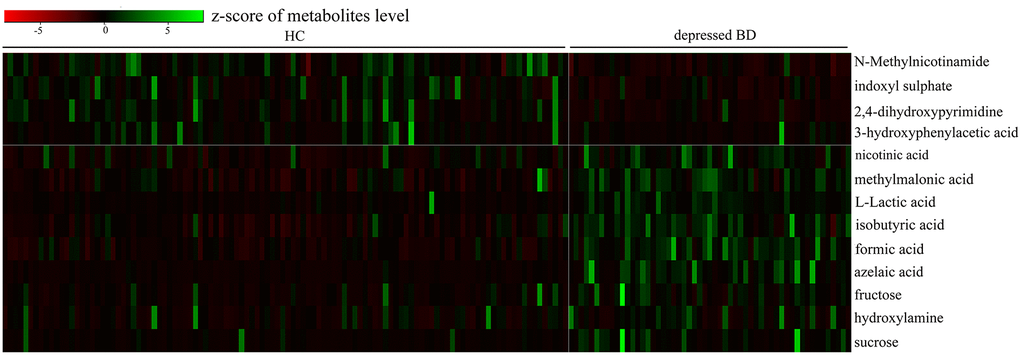 | ccorrelation coefficient obtained from the OPLS-DA model, positive and negative values indicated higher and lower levels in depressed BD subjects, respectively. | |||||||||||||||||||||||||||||||||||||||||||||||||||||||||||||||||||||||||||||||||||||||||||||||||||
