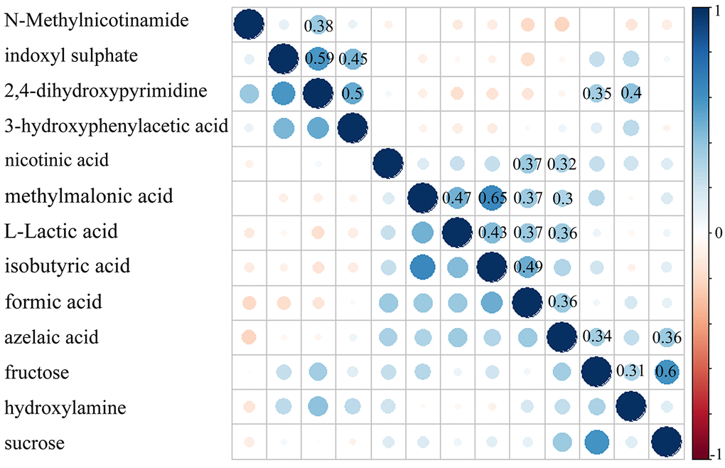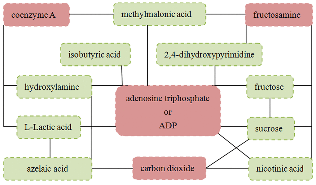 The Pearson correlation analysis was conducted to show the relationship between the differential metabolites. As shown in Figure 4, we found that: i) the four significantly decreased metabolites were positively correlated with each other; ii) the six significantly increased metabolites (nicotinic acid, methylmalonic acid, L-Lactic acid, isobutyric acid, formic acid and azelaic acid) were positively correlated with each other; and iii) the other three significantly increased metabolites were positively correlated with each other. Meanwhile, the metabolite-metabolite interaction network showed that 9 of the 13 differential metabolites could interact with each other directly or through one metabolite, and most metabolites had a close relationship with carbohydrate metabolism and energy metabolism (Figure 5).