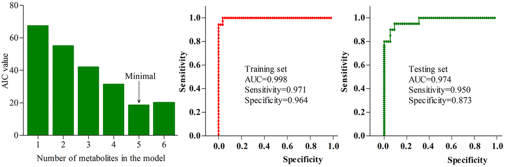 In clinical practice, it would be more convenient and feasible to make a diagnosis based on several metabolites. Thus, in order to find a simplified biomarker panel, we used step-wise logistic-regression analysis (based on AIC rule) to further analyze these differential metabolites. The AIC estimated the quality of each model for a given set of data. It dealt with the trade-off between the simplicity and the goodness of fit of the model. Thus, it could be used to perform model selection. The model with the minimum AIC value was the preferred model. To assess the diagnostic performance of this simplified panel, we conducted ROC curve analysis. The AUC was the evaluation index. The accuracy of classification of this panel was excellent if the AUC value was between 0.9 and 1 [48].