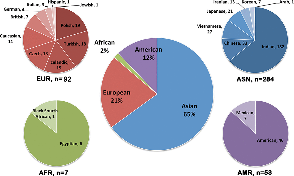 Totally, we retrieved information of 436 MCD cases reported in 38 articles. Most of these cases were Asian ethnicity (65%, 284 families), followed by Europeans (21%), Americans (12%) and Africans (2%, Figure 1). The age of disease onset in these reported MCD patients was highly variable, ranging from 6 to 57 years old, with the average onset age of 25.2±11.8 years old. The number of females and males were almost identical, with no obvious gender preference. Four hundred and eight MCD cases were found to harbor potential pathogenic CHST6 variants. Among them, 270 cases had homozygous CHST6 variants, 98 cases carried compound heterozygous variants, and 40 cases have only a single variant. A total of 181 unique CHST6 variants were previously reported, including 128 missense, 29 frameshift, 17 nonsense, and 4 non-frameshift variants, together with 3 deletions and/or rearrangements in the upstream region of CHST6 (Supplementary Table 1).