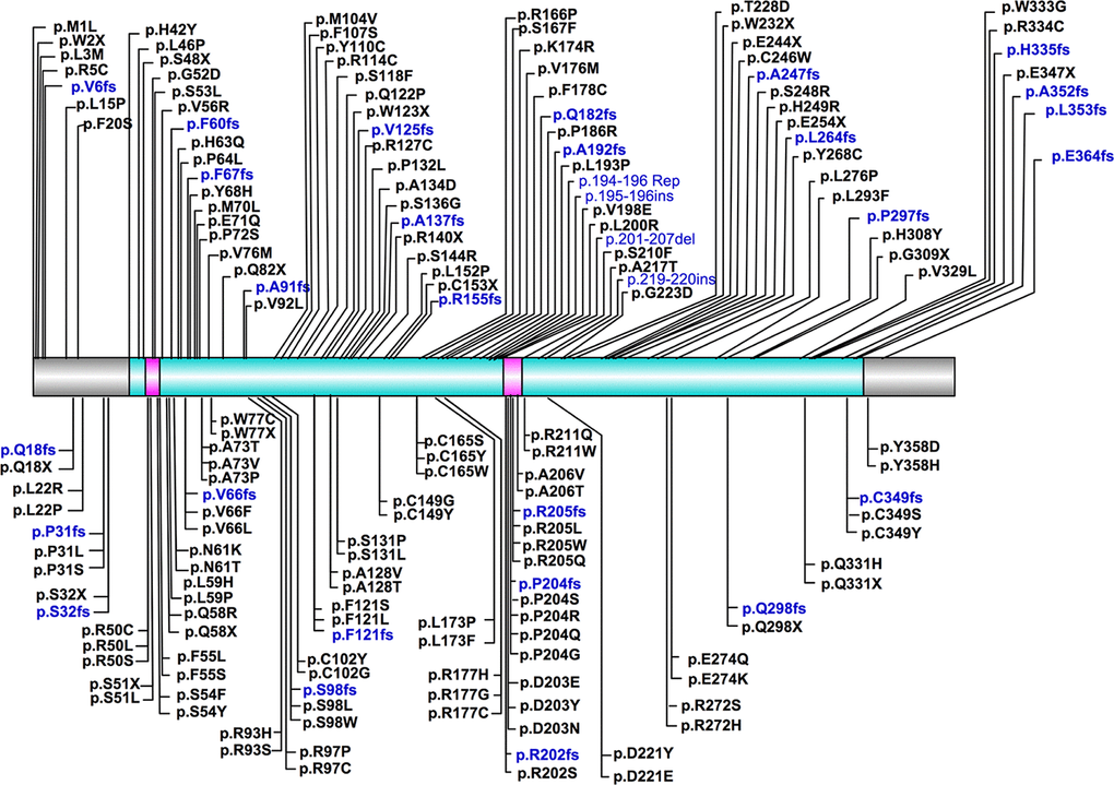 Among the 49 protein-truncating variants, 32 of them were leading to a frameshift (including large deletions) and 17 were nonsense mutations. Majority of the truncating variants were rare, because only nine of them existed in the gnomAD database, with the frequency lower than 4.67E-05. Protein truncating variants were considered to be pathogenic if they caused a termination of the protein before residue 298, since the p.Q298X variant has already been classified as pathogenic by the ClinVar database. It thus showed that 41 of them were classified to be pathogenic.
