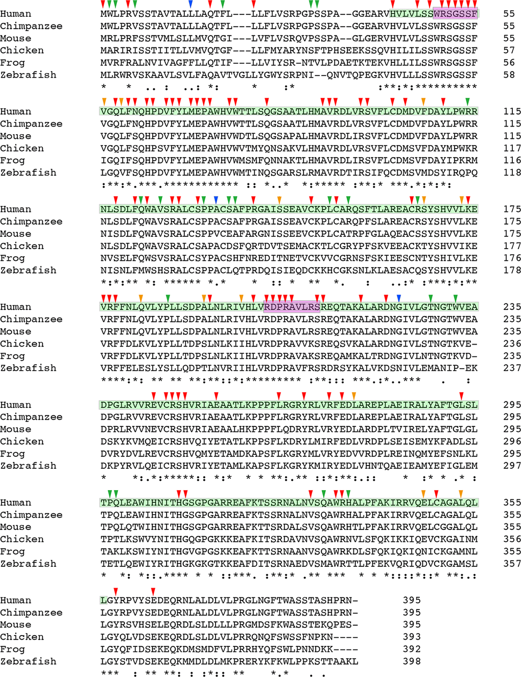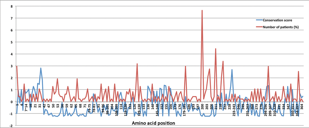 The conservation scores for all residues of CHST6 protein, as well as their confidence intervals were calculated by the Consurf package (http://consurf.tau.ac.il/), using the empirical Bayesian method with the default parameters. The scores were then normalized, so that the average score for all residues was zero, and the standard deviation was one. The lowest score represented the most conserved position in a protein.