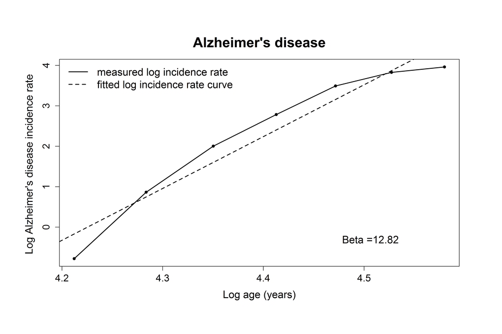 | *Obtained from linear regression model log(Alzheimer’s disease incidencei) = β0 + β1*log(agei) | |||||||||||||||||||||||||||||||||||||||||||||||||||||||||||||||||||||||||||||||||||||||||||||||||||