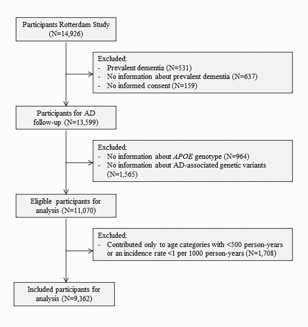 To model AD as a multistage process, we excluded participants with a history of any type of dementia at baseline (N=531) and those who were insufficiently screened for dementia (N=637). We further excluded participants who did not provide informed consent to access medical records or hospital discharge letters (N=159). Lastly, participants without information on their APOE genotype (N=964) or AD-associated genetic variants to calculate the genetic risk score (N=1,565) were excluded, leaving 11,070 participants for analyses (Figure 2).