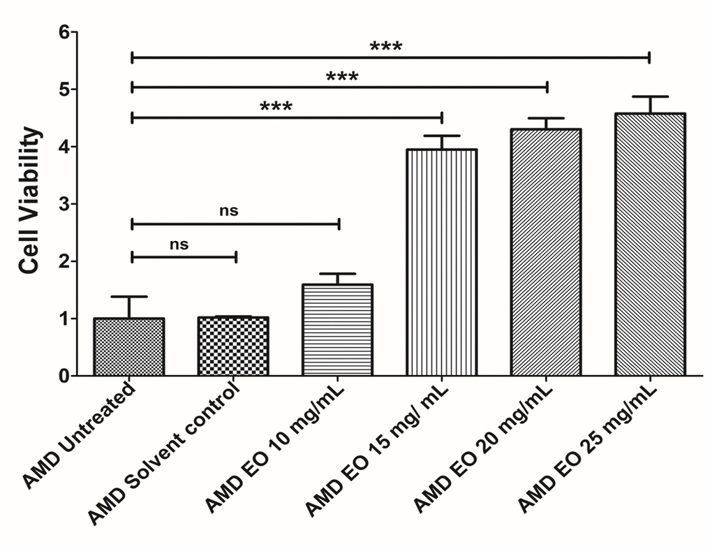 To determine the optimum working concentration of EO for all experiments, we performed an initial concentration titration experiment wherein AMD cybrids were treated with increasing doses of EO i.e, 10, 15, 20, and 25 mg/mL of EO (Figure 1) followed by measurement of viable cell numbers using MTT assay. Although compared to untreated AMD cybrids (Bar 1; 1 ± 0.382 (Mean ± SEM) arbitrary unit (a.u.), n=3), 10 mg/mL EO-treated AMD cybrids (Bar 3; 1.59 ± 0.191 a.u.; n=3) showed a 59% higher viable cell number, the difference was not statistically significant (p=0.2387). However, EO-treated cybrids showed significantly improved viable cell number at 15 mg/mL (Bar 4; 295% increase; 3.95 ± 0.240 a.u.; p<0.001; n=3), 20 mg/mL (Bar 5; 330% increase; 4.30 ± 0.193 a.u.; p<0.001; n=3), and 25 mg/mL (Bar 6; 357.5% increase; 4.575 ± 0.297 a.u.; p<0.001; n=3) compared to their untreated counterparts. No difference (p=0.96) in cell viability was observed between the untreated and solvent control (Bar 2; 1.018 ± 0.018 a.u.; n=3) groups. Based on these results, we chose 25 mg/mL as the optimal working concentration of EO for all experiments performed in this study.