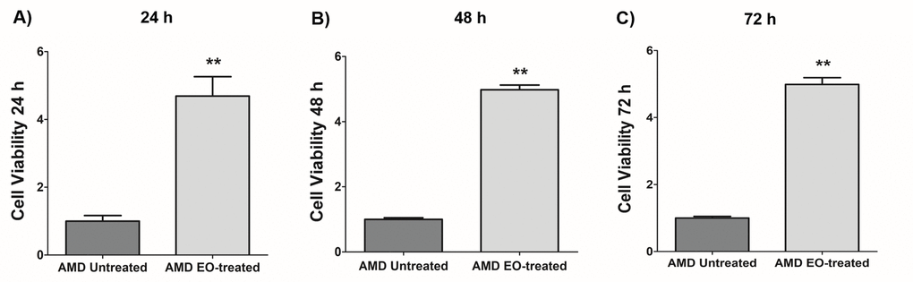 We next examined the effects of treatment of AMD RPE cybrids with 25 mg/mL EO over a time course i.e., at 24 h, 48 h, and 72 h post EO treatment (Figure 2). As anticipated, compared to their untreated counterparts, we observed significantly higher viable cell numbers in EO-treated AMD cybrids at 24 h (369% increase; AMD untreated: 1 ± 0.166 a.u., AMD EO-treated: 4.69 ± 0.571 a.u.; p=0.002; n=6) (Figure 2A), 48 h (398.1% increase; AMD untreated: 1 ± 0.049 a.u., AMD EO-treated: 4.981 ± 0.145 a.u.; p=0.008; n=5) (Figure 2B), and 72 h (398.8% increase; AMD untreated: 1 ± 0.049 a.u., AMD EO-treated: 4.988 ± 0.203 a.u.; p=0.008; n=5) (Figure 2C), suggesting that EO is able to rescue AMD cybrids from cell death [13].