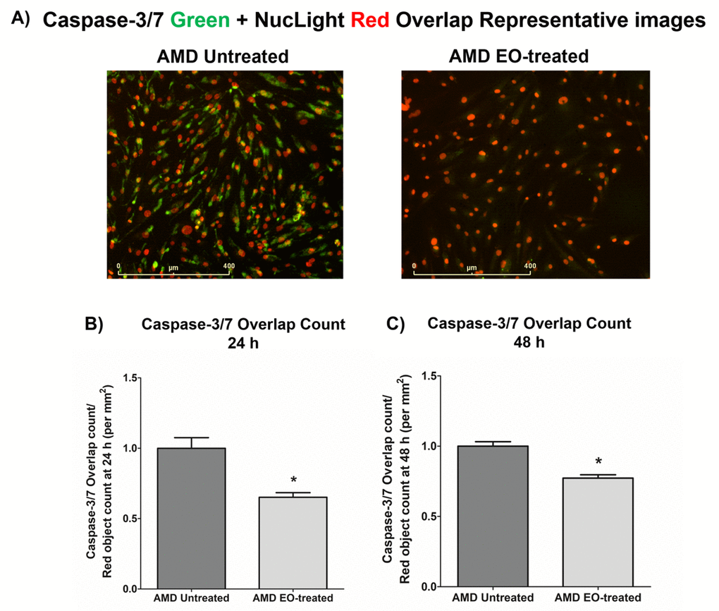 To compare the effects of EO on Caspase-3/7 activity, we morphologically monitored the kinetic activation of Caspase-3/7 using IncuCyte® live-cell imaging (Figure 3). Figure 3A shows representative overlap live-cell images of AMD RPE cybrids stained with Caspase-3/7 Green + NucLight Red reagents. The left panel represents untreated AMD cybrids and the right panel represents EO-treated AMD cybrids. We observed that EO reduced the number of Overlap object count (Yellow) (i.e., Caspase-3/7 Green + NucLight Red staining / NucLight Red object count) at 24 h (34.8% decrease; AMD untreated: 1 ± 0.076 a.u., AMD EO-treated: 0.652 ± 0.032 a.u.; p=0.029; n=4) (Figure 3B) and 48 h (22.7% decrease; AMD untreated: 1 ± 0.032 a.u., AMD EO-treated: 0.773 ± 0.023 a.u.; p=0.001, n=4) (Figure 3C). These results suggest that EO can mitigate Caspase-3/7 mediated apoptosis in AMD RPE cybrids.