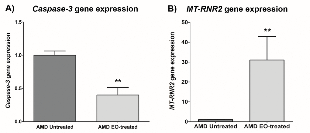 Treatment with EO led to significant downregulation of Caspase-3 gene (60% decrease; AMD untreated: 1 ± 0.063 a.u.; AMD EO-treated: 0.400 ± 0.112 a.u.; p=0.008; n=5) (Figure 4A), suggesting that EO reduces caspase-3-mediated apoptosis in AMD cybrids. Moreover, upregulation of the mitochondria derived peptide (MDP)-coding MT-RNR2 gene (3006% increase; AMD untreated: 1± 0.231 a.u.; AMD EO-treated: 31.06 ± 11.93 a.u.; p=0.008; n=5) (Figure 4B) was observed in EO-treated AMD cybrids compared to untreated cells, suggesting higher MDP production as a result of EO treatment.