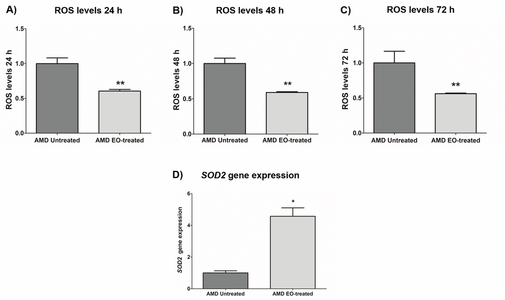 To measure reactive oxygen species levels, we performed ROS assay using H2DCFDA reagent. Addition of EO to AMD cybrids reduced ROS levels at 24 h , 48 h and 72 h time points: 24 h (39.4% decrease; AMD untreated: 1 ± 0.082 a.u., AMD EO-treated: 0.606 ± 0.023 a.u.; p=0.008, n=5) (Figure 5A), 48 h (41.1% decrease; AMD untreated: 1 ± 0.076 a.u., AMD EO-treated: 0.589 ± 0.011 a.u.; p=0.008, n=5) (Figure 5B), and 72 h (43.9% decrease; AMD untreated: 1 ± 0.166 a.u., AMD EO-treated: 0.561 ± 0.009 a.u.; p=0.008, n=5) (Figure 5C). Furthermore, EO-treated AMD cybrids showed upregulation of SOD2 gene compared to their untreated counterparts (357.3% increase; AMD untreated: 1 ± 0.133 a.u.; AMD EO-treated: 4.573 ± 0.533 a.u.; p=0.029; n=4) (Figure 5D). These results suggest that EO can reduce oxidative stress in AMD cybrids.