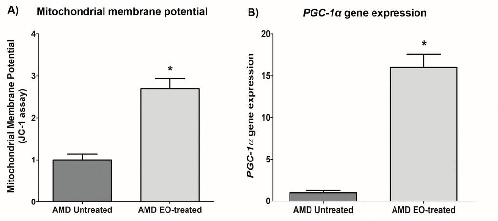 Using the JC-1 dye, we compared the mitochondrial membrane potential (ΔΨm) between untreated and EO-treated AMD cybrids, and found significantly higher ΔΨm in EO-treated AMD cybrids. Therefore, EO can enhance the oxidative redox state of AMD cybrids, contributing to preservation of mitochondrial integrity and function in AMD cybrids. Our data were in agreement with recent studies showing that EO positively contributes to mitochondrial health by enhancing the spare respiratory capacity [16]. QRT-PCR analyses demonstrated that EO-treated AMD cybrids had significant upregulation of PGC-1α (peroxisome proliferator-activated receptor gamma coactivator 1-alpha) gene compared to untreated AMD cybrids. PGC-1α is an important regulator of mitochondrial biogenesis and its downregulation contributes to AMD pathology [38]. Moreover, PGC-1α drives human RPE mitochondrial function and induces antioxidant capacity [39].