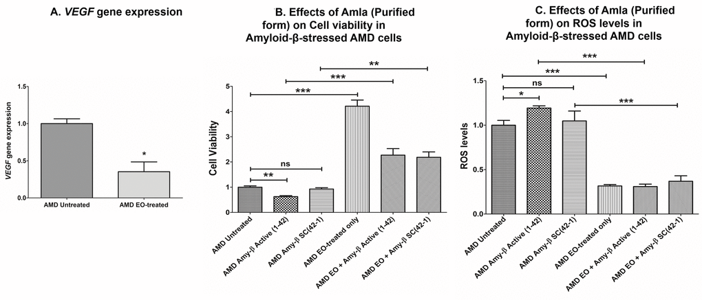 Effect of EO on VEGF gene expression and on cell viability and ROS levels in amyloid-β-stressed AMD cells