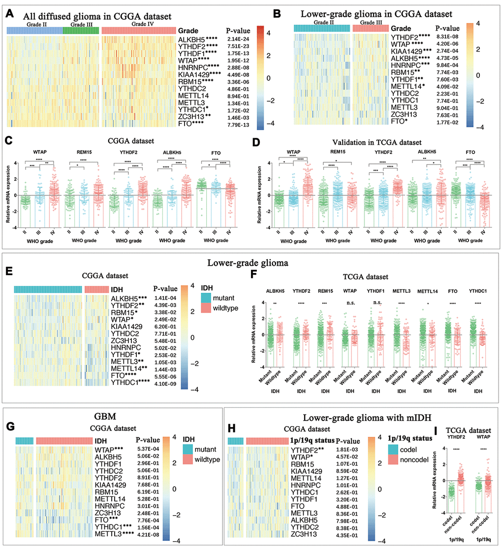 One-way ANOVA was used to compare the expression level of m6A RNA methylation regulators in gliomas with different WHO grades and TCGA subtypes, and t-tests were used to compare the expression levels in gliomas for age, gender, IDH status, and 1p/19q codel status.